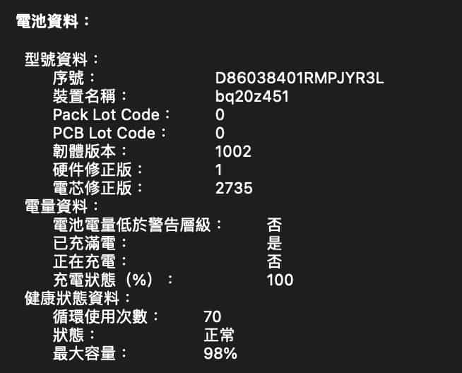 可以知道電池的狀態,循環使用次數,最大容量,不過最近的更新中,卻取消了顯示電量 mAh 資訊,改為百份比顯示。